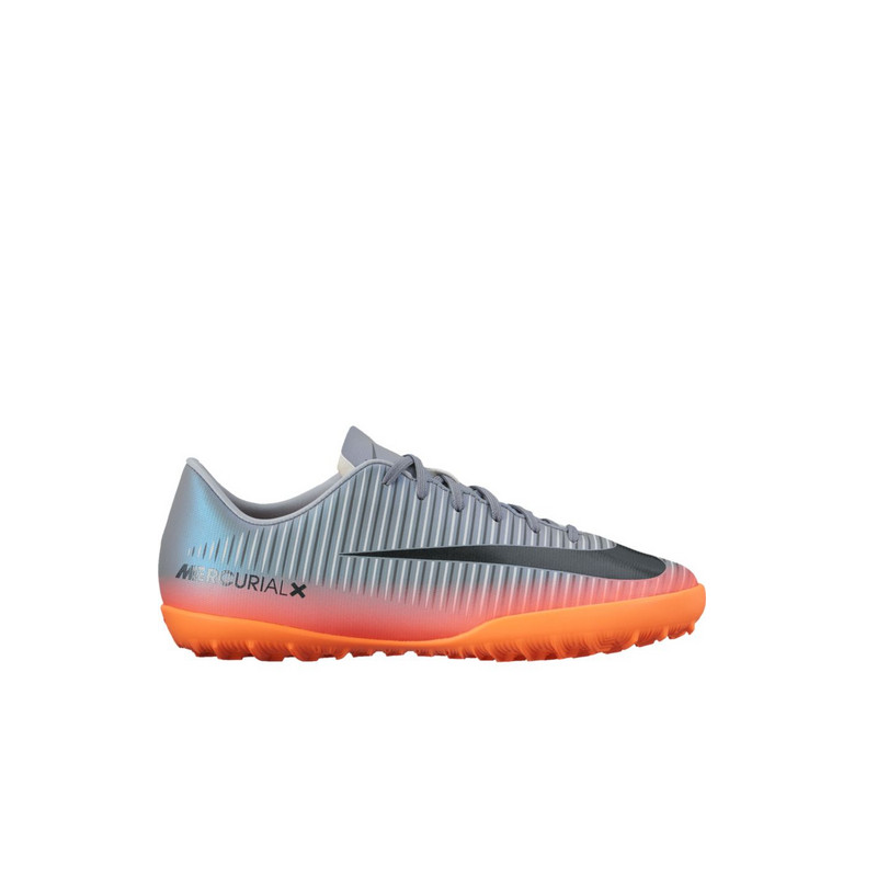 NIEZRÓWNANA KONTROLA I PRZYCZEPNOŚĆ Buty piłkarskie na nawierzchnię typu turf dla małych/dużych dzieci Nike Jr. MercurialX Vapor XI CR7 mają teksturowaną cholewkę i podeszwę zewnętrzną z niebrudzącej gumy, dzięki czemu zapewniają lepszą kontrolę nad piłką i przyczepność podczas gry na sztucznej nawierzchni. Zalety Cholewka z syntetycznej skóry z wytłoczonym poziomym wzorem daje większą kontrolę Niskoprofilowy nosek umożliwia lepsze panowanie nad piłką Antypoślizgowe wykończenie poprawia przyczepność wewnątrz buta Zaprojektowana z myślą o grze na nawierzchni typu turf (TF) podeszwa zewnętrzna z sześciokątnymi gumowymi korkami zapewnia przyczepność na syntetycznych nawierzchniach Cristiano Ronaldo Rzadko się zdarza, aby cudowne dziecko przewyższyło pokładane w nim oczekiwania. Cristiano Ronaldo jest wyjątkiem od tej reguły, odnosząc kolejne zwycięstwa i bijąc wszelkie rekordy na każdym etapie kariery. Poczynając od pierwszego profesjonalnego kontraktu podpisanego w wieku 10 lat, a kończąc na wielokrotnie przyznawanym mu tytule gracza roku, Cristiano Ronaldo zdominował największe światowe boiska swoją prędkością, techniką i wyczuciem piłki.
