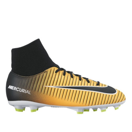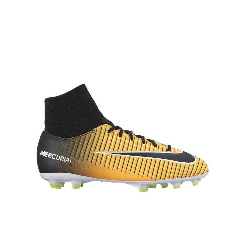 Dziecięce buty piłkarskie na miękką murawę Nike Mercurial Victory VI Dynamic Fit (SG) łączą w sobie cholewkę bez języka z wytłoczeniami, dzięki czemu zapewniają odpowiednie dopasowanie, czucie piłki i przyczepność potrzebną podczas szybkich rozgrywek. - Kołnierz Dynamic Fit łączy dolną część nogi, kostkę i stopę.- Poziome wytłoczenia zwiększają czucie piłki.- Pozbawiona języka konstrukcja otacza stopę, zapewniając dokładne dopasowanie.- Wzór rozmieszczenia korków oferuje przyczepność na twardej murawie.- Skóra syntetyczna / Materiał nylonowy