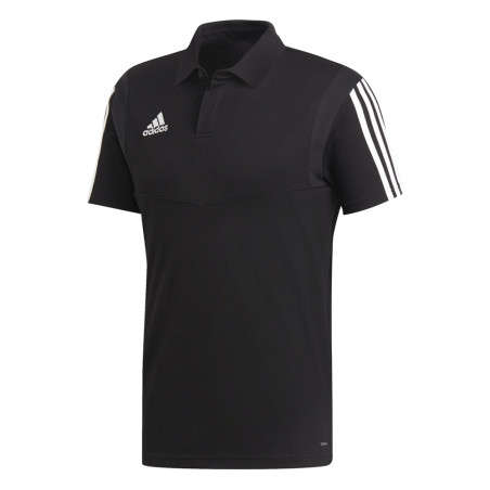 Męska koszulka piłkarska typu polo, model Tiro 19 prawie w całości został wykonany z bawełny. Koszulka została uszyta w standardowym kroju w technologii climalite, która odprowadza pot z powierzchni skóry do zewnętrznej warstwy w celu szybszego odparowania. Pod kołnierzem znajdują się guziki za pomocą których możemy rozpiąć koszulkę. Dla lepszego dopasowania rękawy zostały wykończone elastycznymi ściągaczami. Oba rękawki zostały ozdobione trzema charakterystycznymi paskami adidas, na prawej piersi umieszczono wyszywane logo adidas.